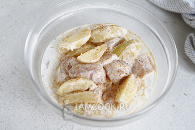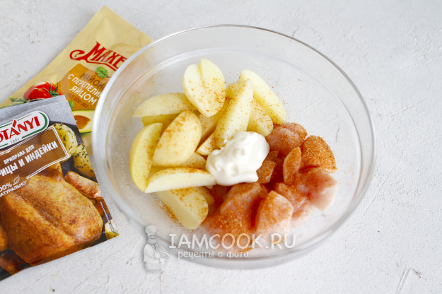 Кусочки курицы и дольки картофеля переложите в чашу. Добавьте специи и майонез.