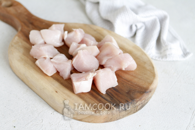Сполосните мясо курицы и обсушите бумажным полотенцем. Нарежьте его крупными порционными кусочками. Мелко нарезать не рекомендую, филе курицы высохнет и на выходе у вас получится сухое мясо.