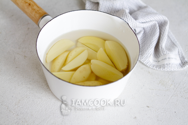 Чтобы сократить время приготовления, рекомендую отварить картофель в слегка подсоленной воде. Я варила буквально 7 минут после закипания.