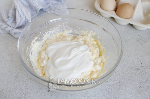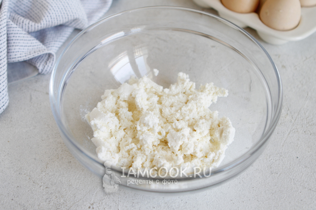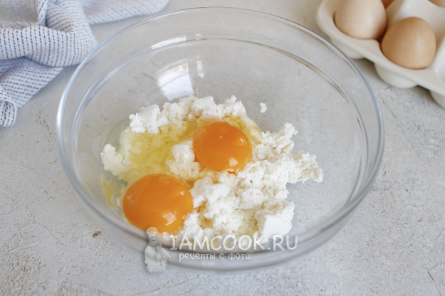 Введите два яйца и слегка перемешайте творог с яйцами.