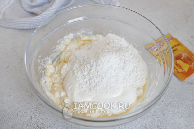 Подготовьте муку и разрыхлитель. Муку можно выбрать любую: пшеничную, цельнозерновую, рисовую. Если добавите миндальную или кокосовую, то сырный пудинг будет прям по кето диете.