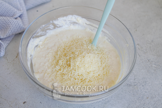 В самом конце добавьте любой тертый сыр. Вмешайте его в тесто.