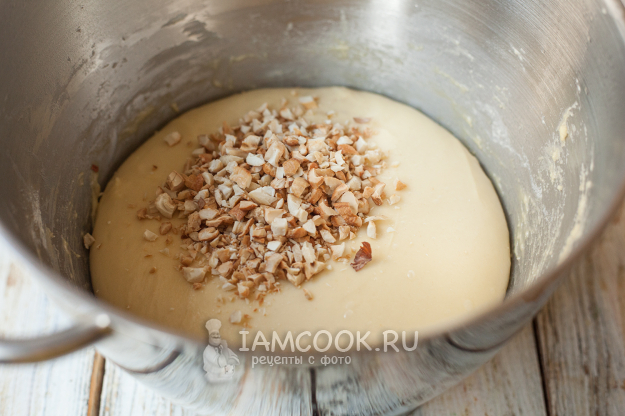 После подъема добавьте в тесто рубленые орехи (у меня были кешью, но можно взять и другие) и равномерно распределите их руками.