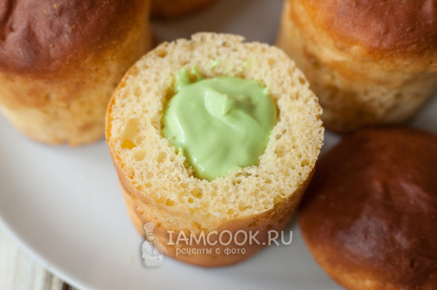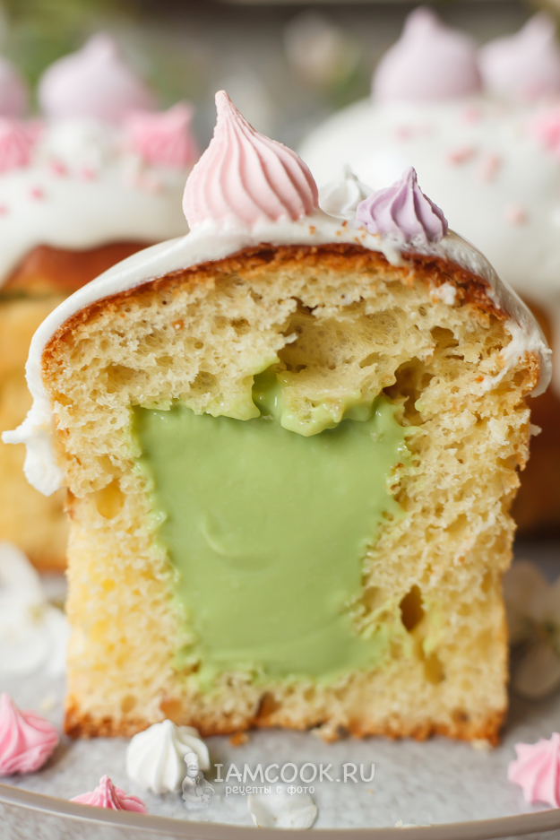 Аккуратно срежьте шапочки каждого кулича, из середины выньте мякиш и заполните фисташковой начинкой получившуюся полость. Верните шапочки на место (желательно точно состыковать срезы).