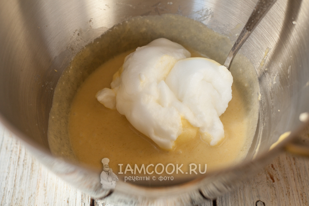 К желтково-дрожжевой массе добавьте примерно треть белков, аккуратно вмешайте их.