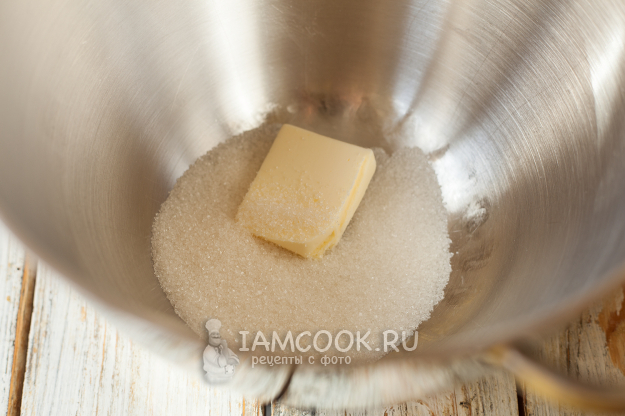 В чаше миксера смешайте мягкое сливочное масло и оставшийся сахарный песок.