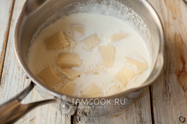 Нагрейте сливки. Как только они начнут кипеть, снимите с огня и добавьте в них разломанный на кубики белый шоколад.
