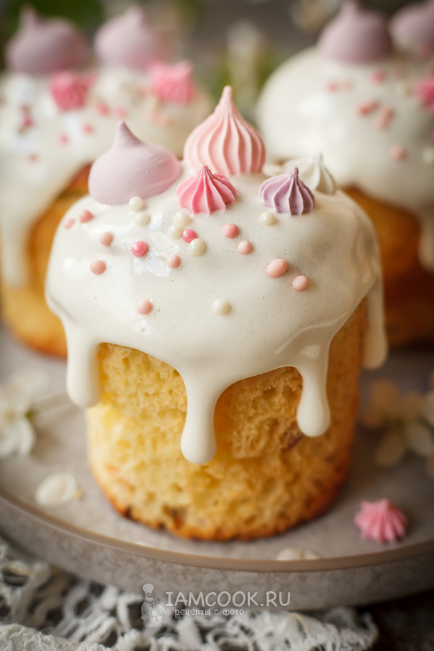 Всё, осталось только украсить куличи. У меня было разноцветное безе и кондитерская посыпка.
