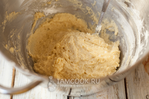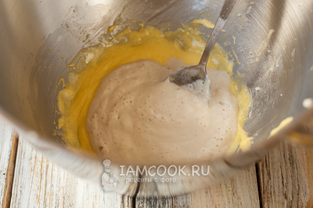 Влейте опару к желтковой массе и перемешайте.