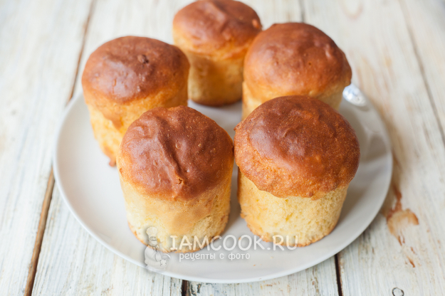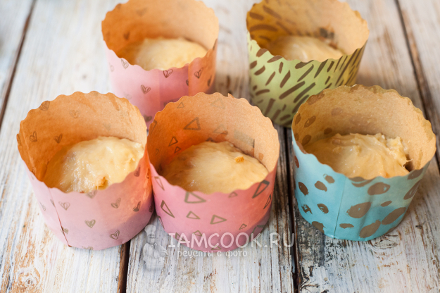 Наполните формы для куличей тестом на 1/3 высоты. Чтобы шапочки получились аккуратными, каждый кусочек перед помещением в форму обязательно округлите.