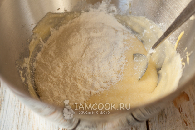 Затем просейте треть муки и снова перемешайте.