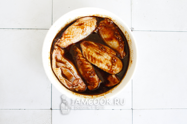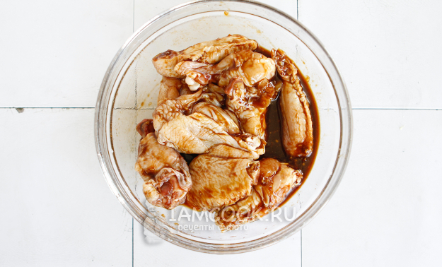Залейте готовым маринадом крылья и уберите их в холодильник на 30 минут.