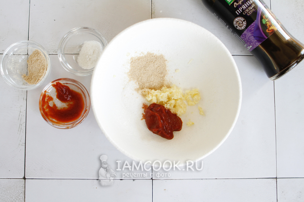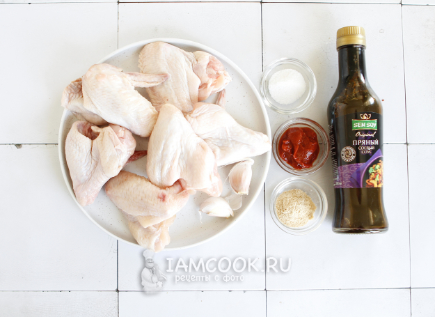 Соберите все продукты по списку и приступим к приготовлению куриных крылышек в томатно-соевом соусе.