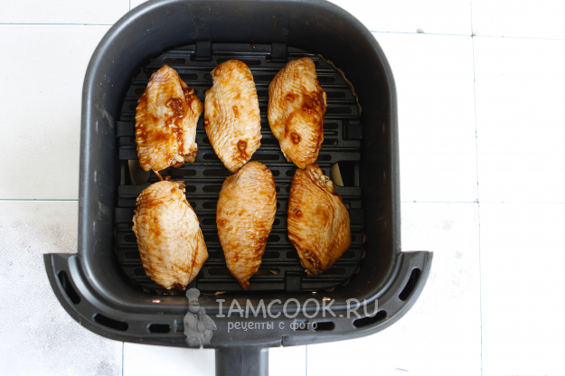 Я готовила крылья в аэрогриле, выложив их на решетку. Решетку предварительно ничем не смазывала. Через 7 минут от начала готовки крылья перевернула. По времени весь процесс занял у меня ровно 15 минут.