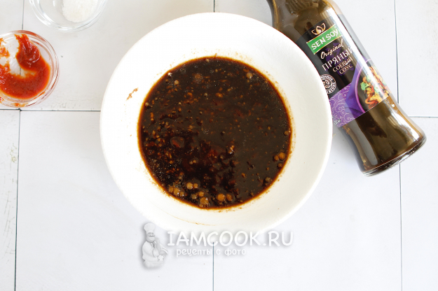 Влейте соевый соус и тщательно перемешайте все ингредиенты.