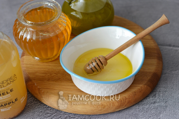 Первым делом приготовьте заправку, смешав в мисочке мёд, оливковое масло и яблочный уксус.