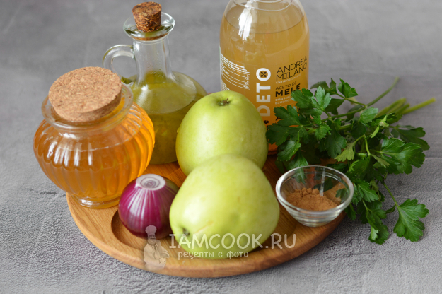 Соберите все необходимые продукты для приготовления салата из яблок и лука.
