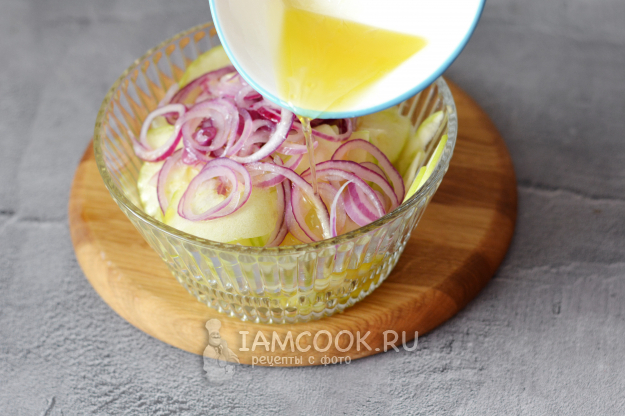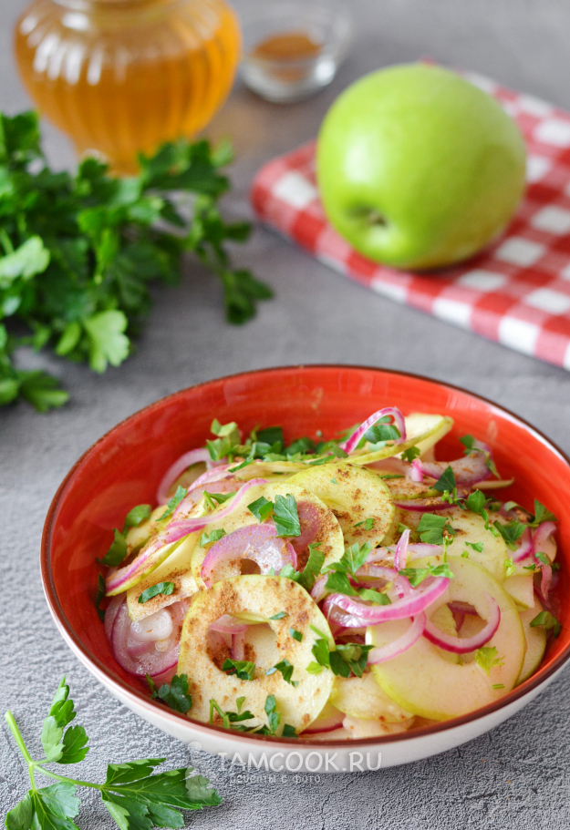 В миску сложите ломтики яблок, ошпаренный лук и полейте заправкой. Всё перемешайте и салат из яблок и лука готов. Соль не нужна! Вся фишка в сладкой заправке.