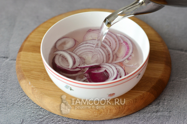 Лук нарежьте кольцами или полукольцами и залейте на несколько секунд кипятком, чтобы убрать горечь. Затем откиньте на сито и обдайте холодной водой, чтобы лук не сварился и быстро остыл.