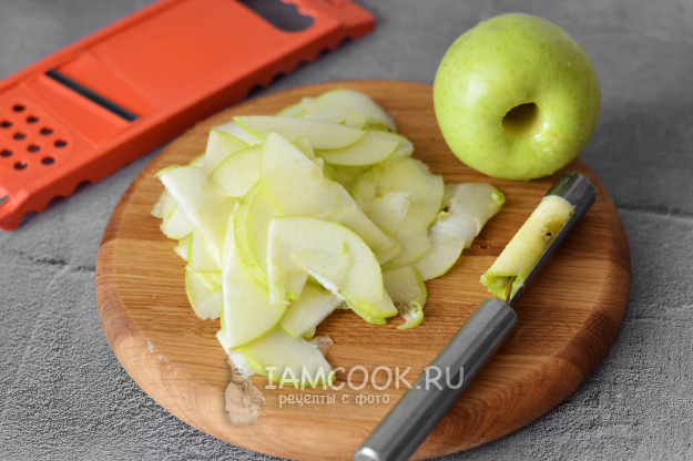 У яблок удалите сердцевину и нашинкуйте тоненькими ломтиками ножом или при помощи шинковки.