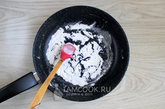 На сухой без масла сковороде подсушите при помешивании муку. Ориентируйтесь больше не на её цвет, а на аромат. Как повеет ореховым, то прекращайте.