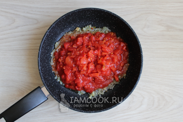Затем добавьте к луку консервированные резаные томаты. Пожарьте всё вместе при помешивании 2-3 минуты.