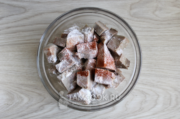 Нарежьте язык на куски - кубики. Посыпьте куски языка этой мукой и всеми специями.