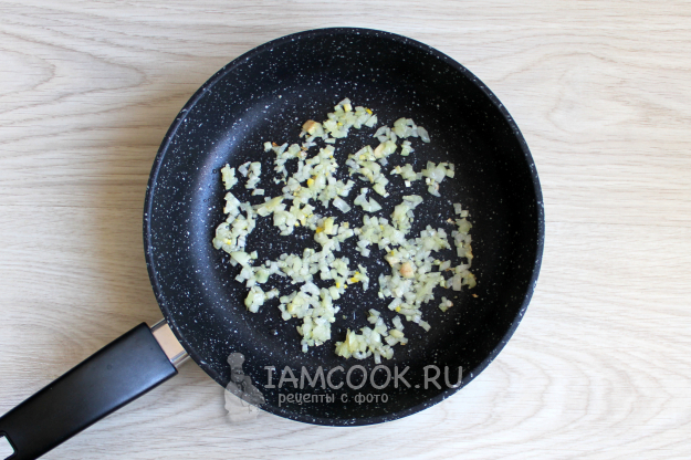 Лук нашинкуйте, например, мелко, посолите, слегка посыпьте сахаром. Обжарьте лук до зарумянивания при помешивании на топлёном масле.