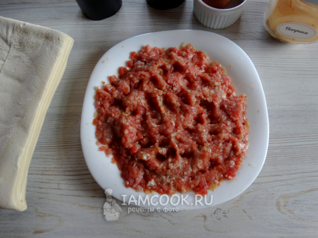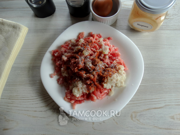 В фарш добавить измельченный лук, соль, перец и паприку.