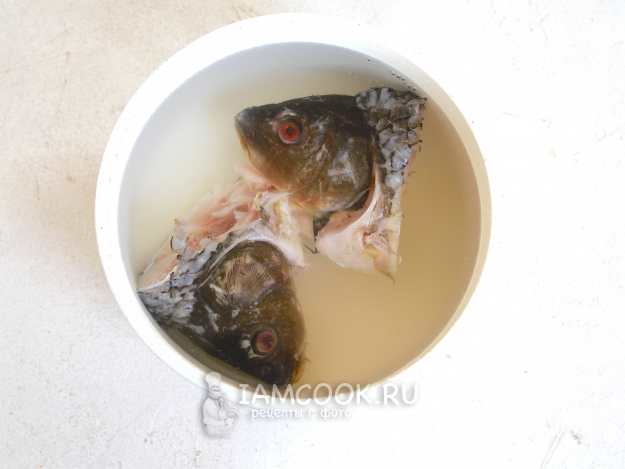 Сазан был некрупный, поэтому бульон я готовила из двух голов. На 10 минут замочите головы в прохладной воде, чтобы смыть остатки крови. В кастрюлю влейте холодную воду, я использую бутилированную, и поместите в нее головы сазана.
