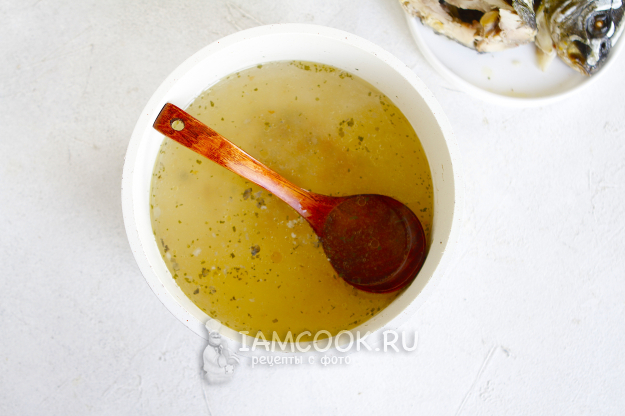 У меня получился насыщенный, ароматный бульон, без костей и чешуек, поэтому процеживать я его не стала.