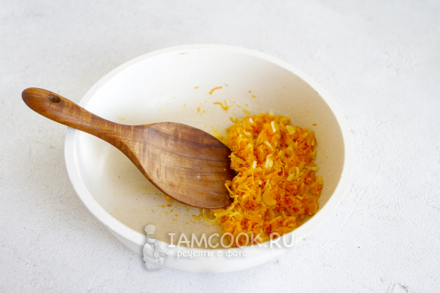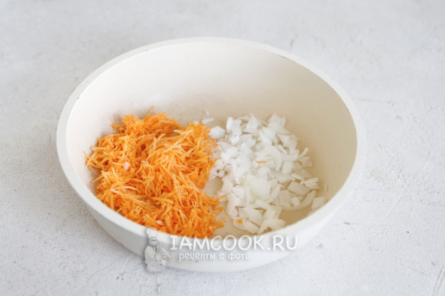 Морковь почистите и натрите на мелкой терке. Вторую половину лука нарежьте произвольно.