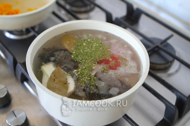 Как только закипит вода, убавьте огонь, снимите пенку. Добавьте в кастрюлю помидор, полголовки лука, лавровый лист, перец горошком и немного соли. Варите бульон на небольшом огне 25-30 минут.