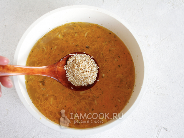 Бульон доведите до кипения, поварите 5 минут и добавьте киноа.