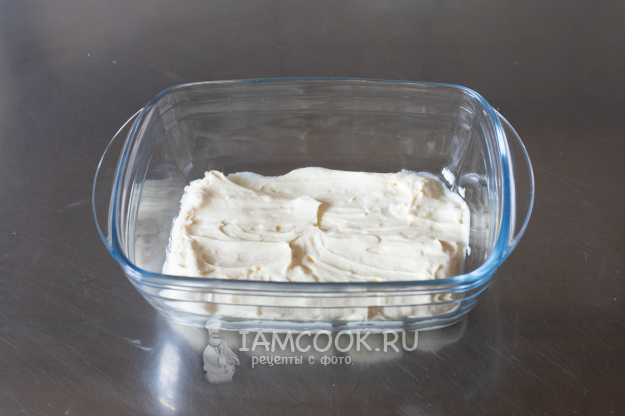 Выложить на дно формы тоненький слой крема (примерно одну треть от общего количества, но это должна быть, так сказать, наименьшая одна треть).