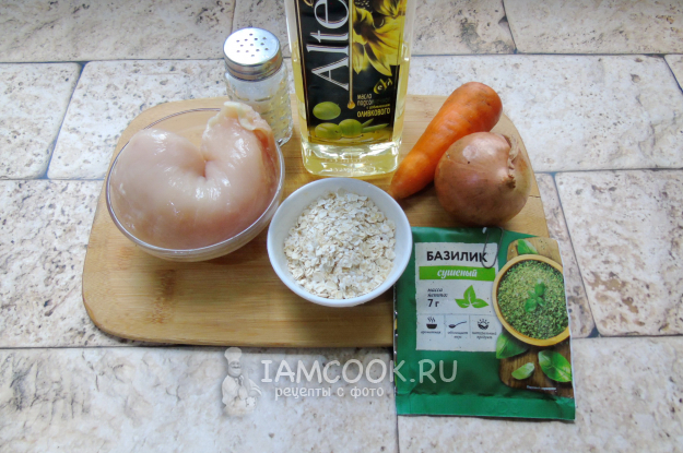 Соберите ингредиенты для приготовления овсяной каши с курицей.