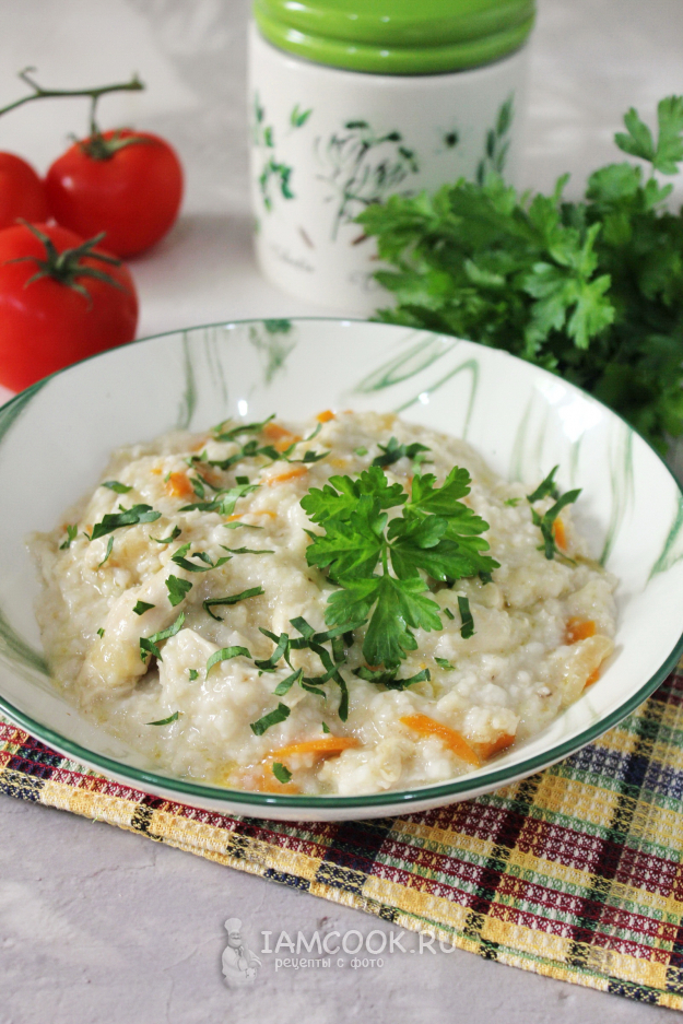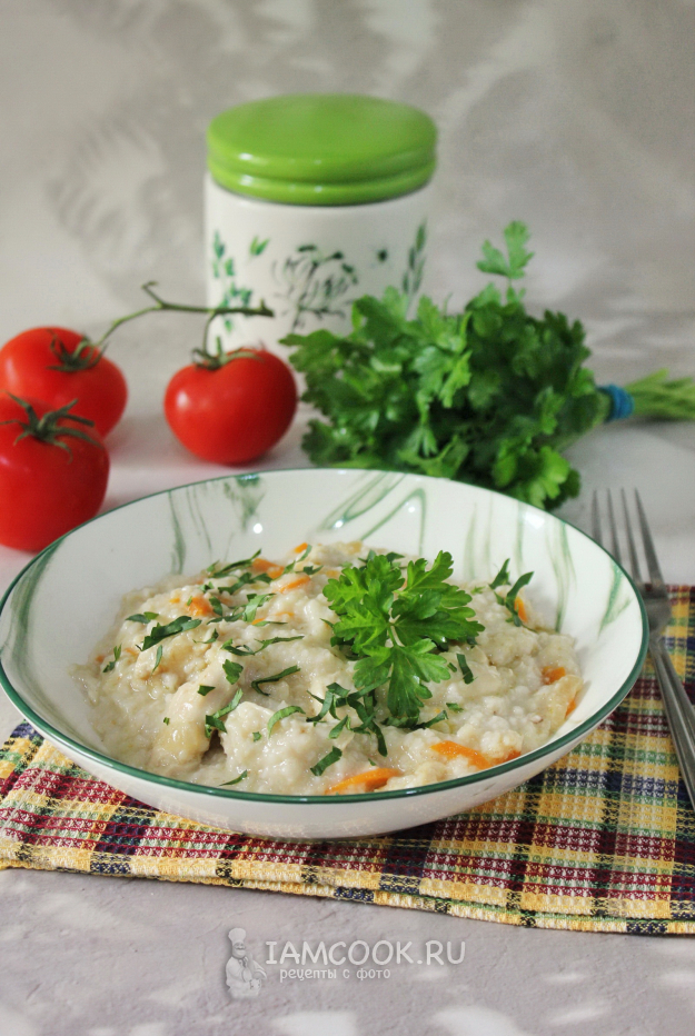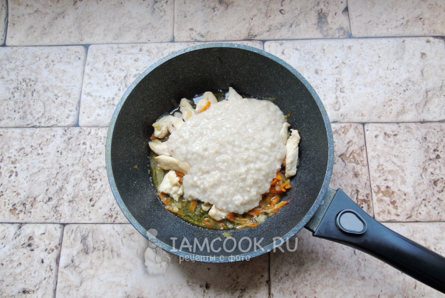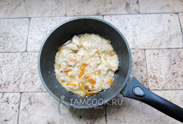 Овсяную кашу добавьте в сковороду с курицей и овощами.