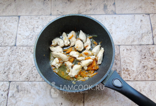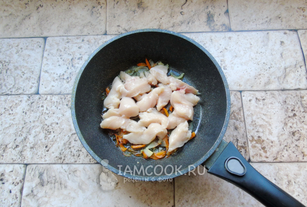 Куриное филе помойте и нарежьте небольшими кусочками. Добавьте к овощам на сковороде.