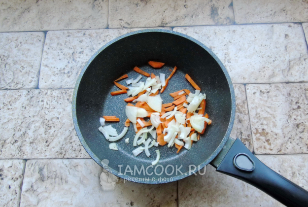 Лук и морковь очистите, помойте. Нарежьте произвольно, но не очень крупно. Выложите в сковороду.
