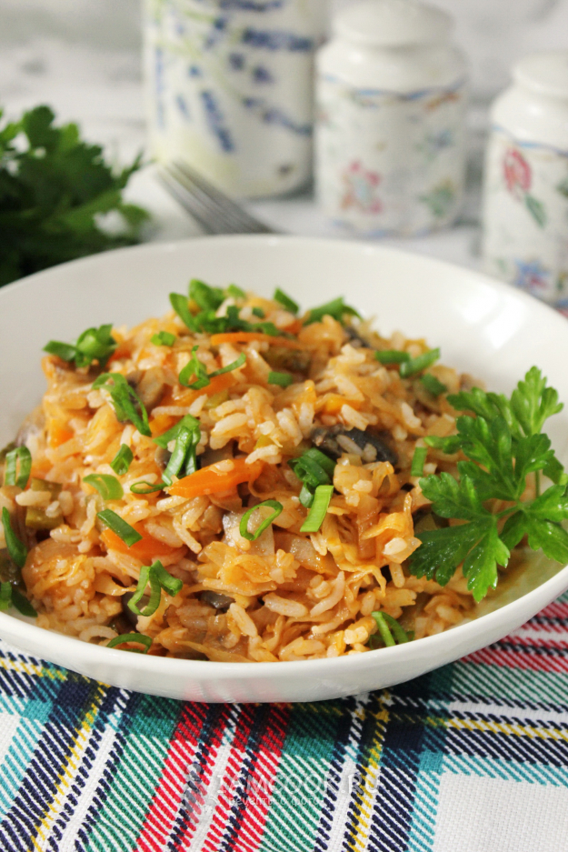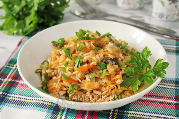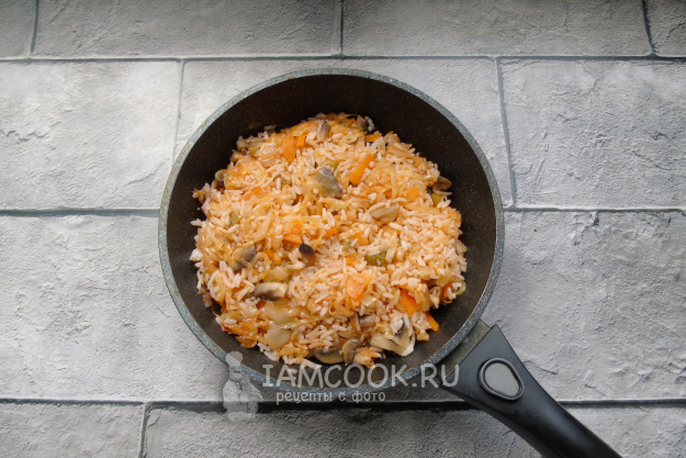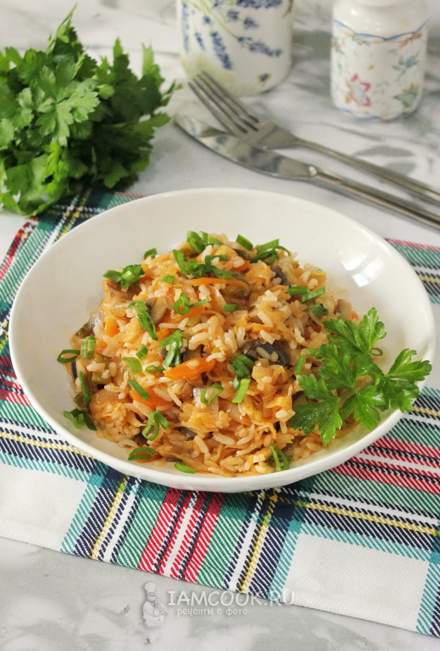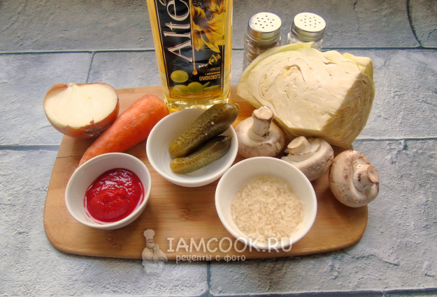 Соберите ингредиенты для приготовления грибной солянки с рисом.