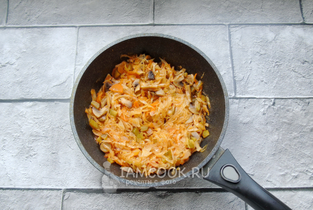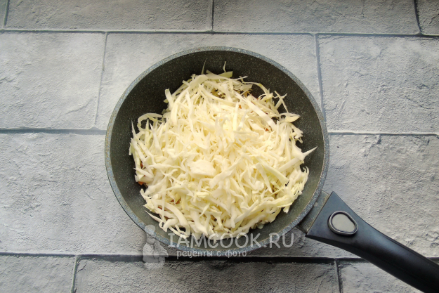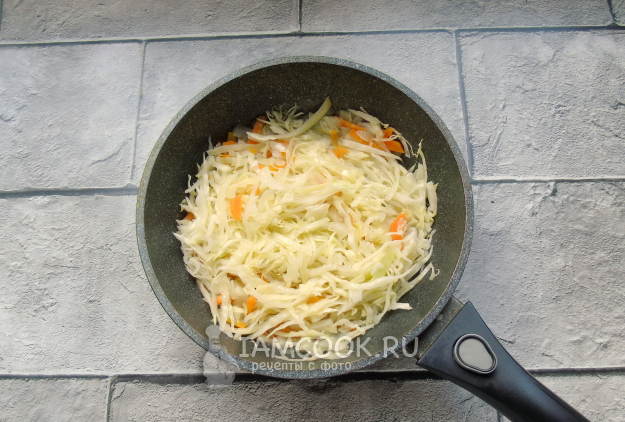Капусту нарежьте соломкой и добавьте к луку и моркови.