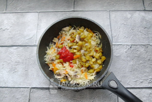 Затем добавьте нарезанный соленый огурец, томатную пасту и сахар.
