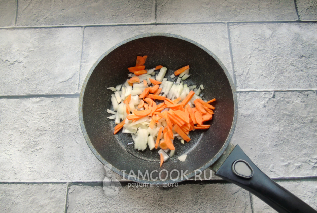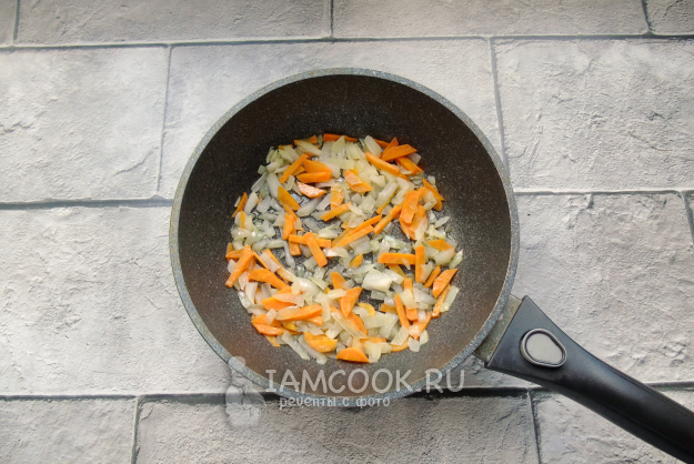 Лук и морковь очистите, помойте, нарежьте произвольно и выложите в сковороду с растительным маслом.