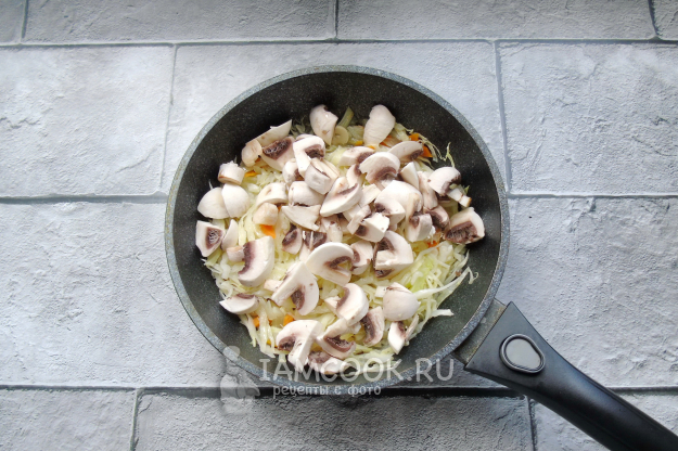 Шампиньоны очистите, помойте и нарежьте произвольно. Добавьте к луку, моркови и капусте. Посолите и поперчите. Продолжайте готовить солянку еще 8-10 минут.