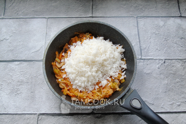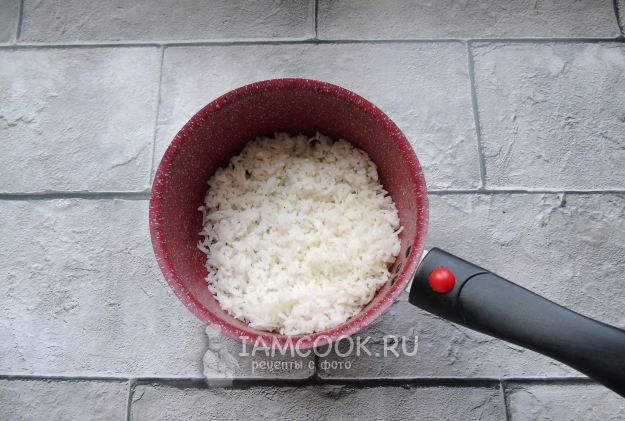 Параллельно отварите рис. Хорошо помойте его, выложите в кастрюлю и залейте водой в соотношении риса к воде 1:3, посолите по вкусу. Варите до готовности, после откиньте на дуршлаг и промойте кипяченой водой.