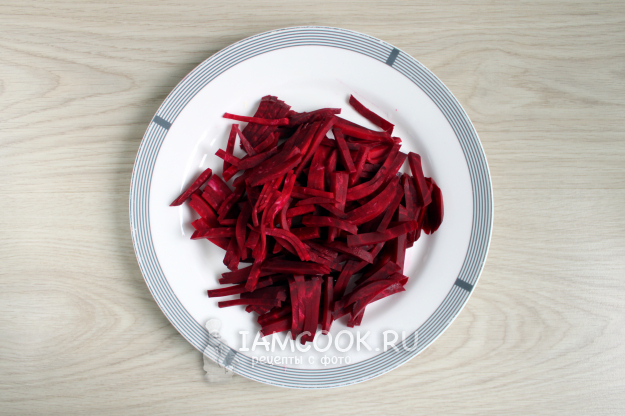 При следующем закипании - свёклу, нарезанную соломкой, нашинкованный лук и давленые зубчики чеснока.