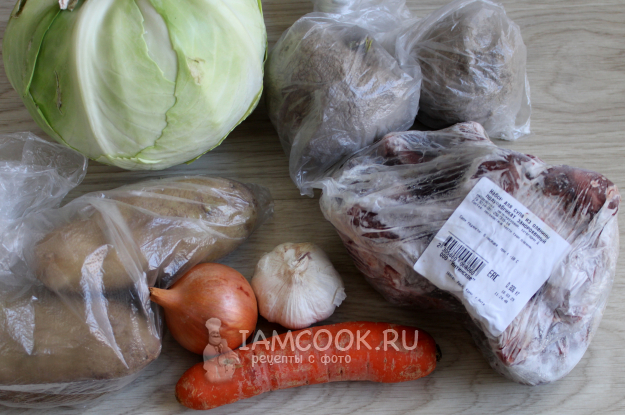 Для борща из оленины подготовьте ингредиенты по списку к рецепту. Кроме супового набора из хребтов, подходят и другие отрубы на кости. Количество овощей выбирайте на свой вкус. Мой вариант: много капусты, много свеклы, морковь и лук - по норме, а картофель - символически.