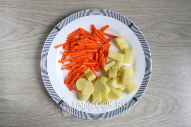 При следующем закипании добавьте крупно нарезанные картофель и морковь.
