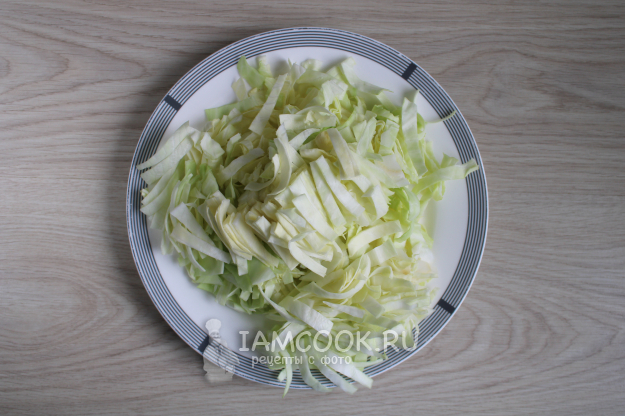 Моя капуста была твердая, поэтому была нашинкована и добавлена первой.