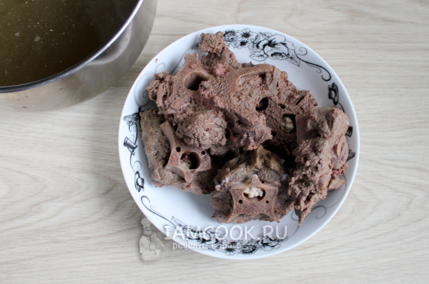 Первым делом нужно сварить насыщенный бульон из супового набора из мяса на кости.